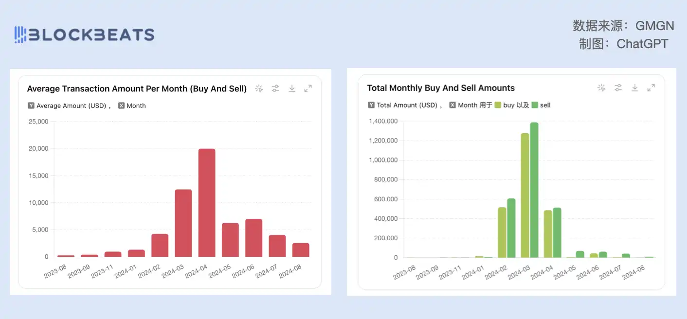 因为在 3 月获得了超高收益,巨鲸哥在此之后的出手也变得阔绰起来。4 月是他单笔交易金额最大的一个月份,达到了 20 万美元。但整体投入的资金量却回归到了和 2 月差不多的水平,交易次数也降低到 50 笔,说明随着大盘行情开始降温,巨鲸哥没有被财富冲昏头脑,冷静地选择了减少操作。