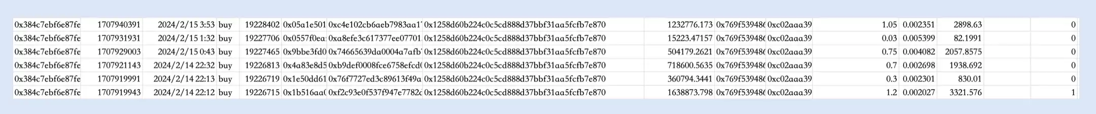 2 月 14 号 22:12,巨鲸哥第一次买入$GPU。六个小时里面,巨鲸哥一共花费 4 ETH 进行了 6 笔买入操作。