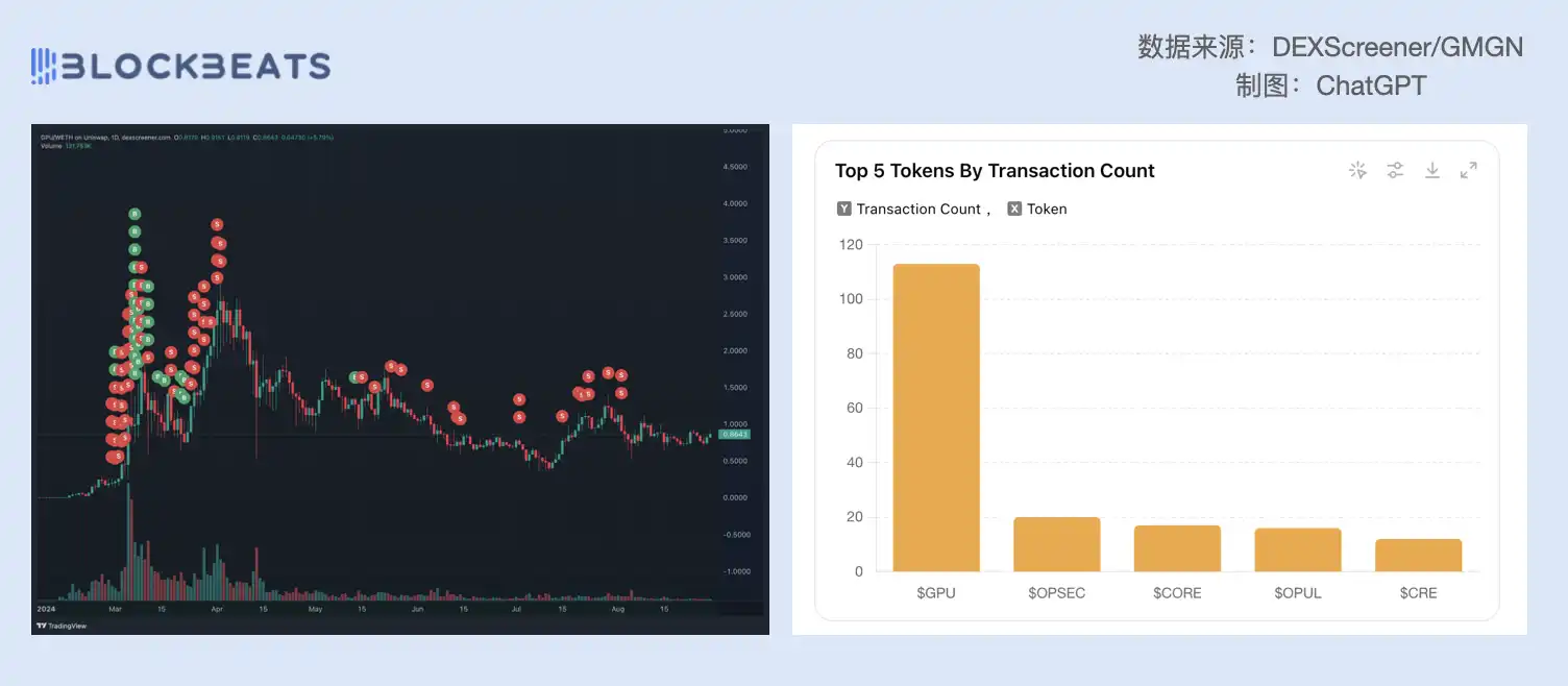 但我最佩服巨鲸哥的,不是他入场点位卡得非常好,而是能够在随后持续下注,币价上涨过程中不停地做波段。巨鲸哥不仅随着币价走高陆续出货,还能在价格走低的时候接回来。$GPU 实际上是巨鲸哥买卖操作最频繁的一个币,达到 113 次,和其他持仓币种完全不在一个量级上。