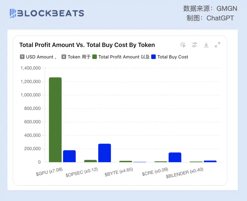 答案很显然是$GPU,实现了 126 万美元的利润回报,而且他在$GPU 上收获的回报是远大于其他币种的。$GPU 之后,几个让它赚了最多钱的币,一个是赚的不多了,另一个是倍数也不高了,看来一个人再怎么厉害和幸运,也就只能在一个币上做到封神。