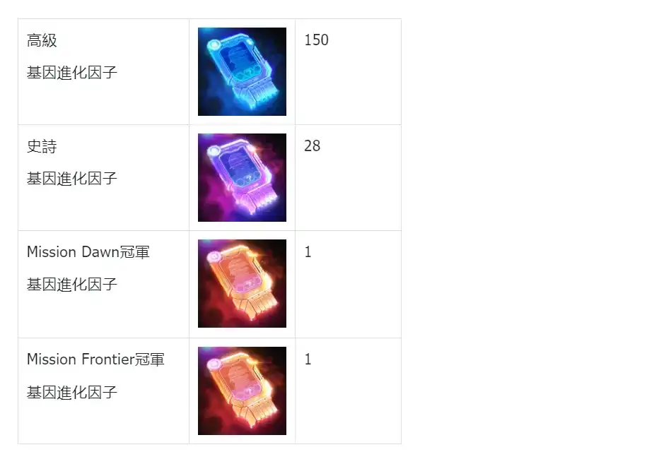 基因进化因子有四种,分别是稀有、史诗、以及两次测试的冠军因子