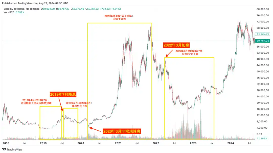 美联储主席鲍威尔最近表示「调整政策的时候到了」,暗示降息将至。美联储降息是否一定会推动比特币价格上涨?