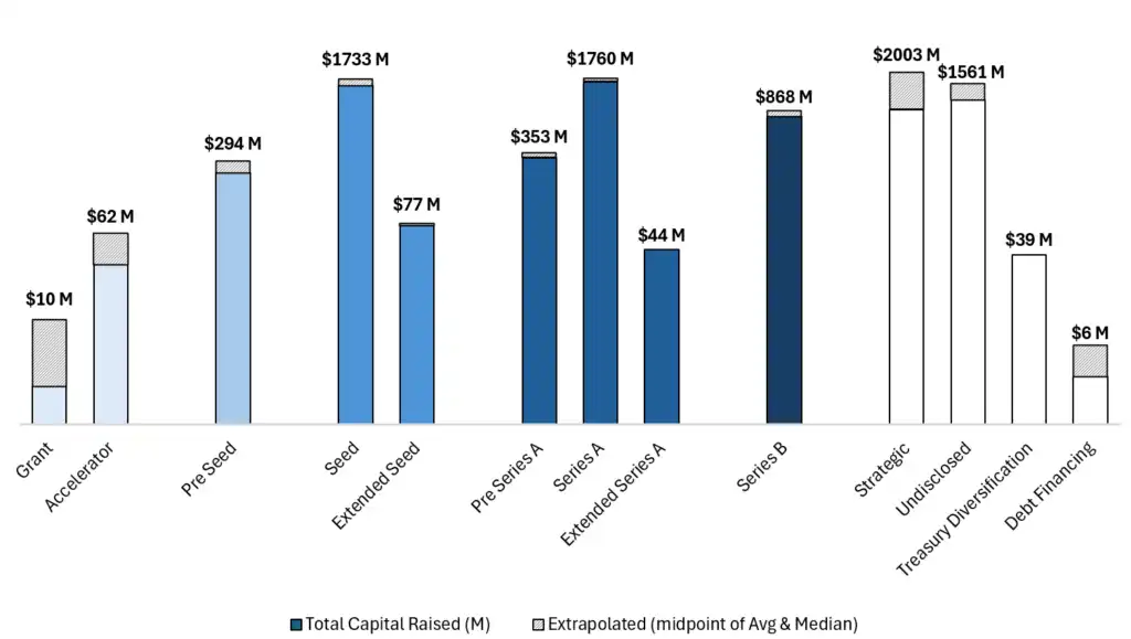 下面我们将仔细研究这些数字。我们发现,种子轮是融资最活跃的阶段,其次是 Pre-Seed 轮。有趣的是,我们发现将融资阶段区分为这两轮的公司越来越少,因为有时种子轮会被私募轮取代。