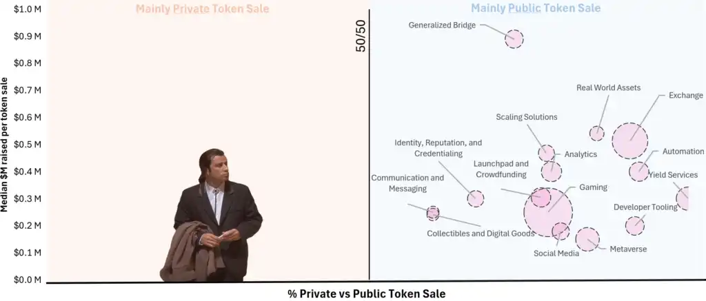 在 X 轴上,以正中间为分割线,您看到左边是私募,右边是公售,Y 轴显示的是通过融资额的中位数,气泡的大小表示代币上市的数量。