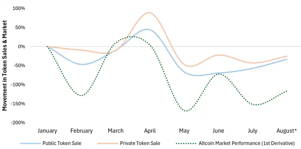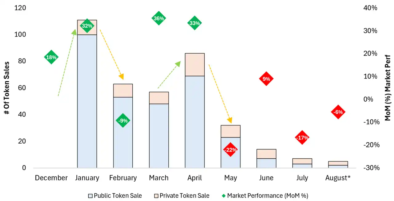 纵观过去一年,加密货币市场共上市了 375 个代币,其中通过私募的有 70 个,通过公售的有 305 个。我们通过将代币上市的数量和 Altcoin 市值的涨跌幅做成一张图表,可以看到,代币上市的数量和 Altcoin 市值的涨幅是呈现正相关的,当 Altcoin 的市值处于上涨趋势时,代币上市的数量会在次月急剧上升。过去几个月,由于假期休息日多以及市场表现不佳,导致活动减少。