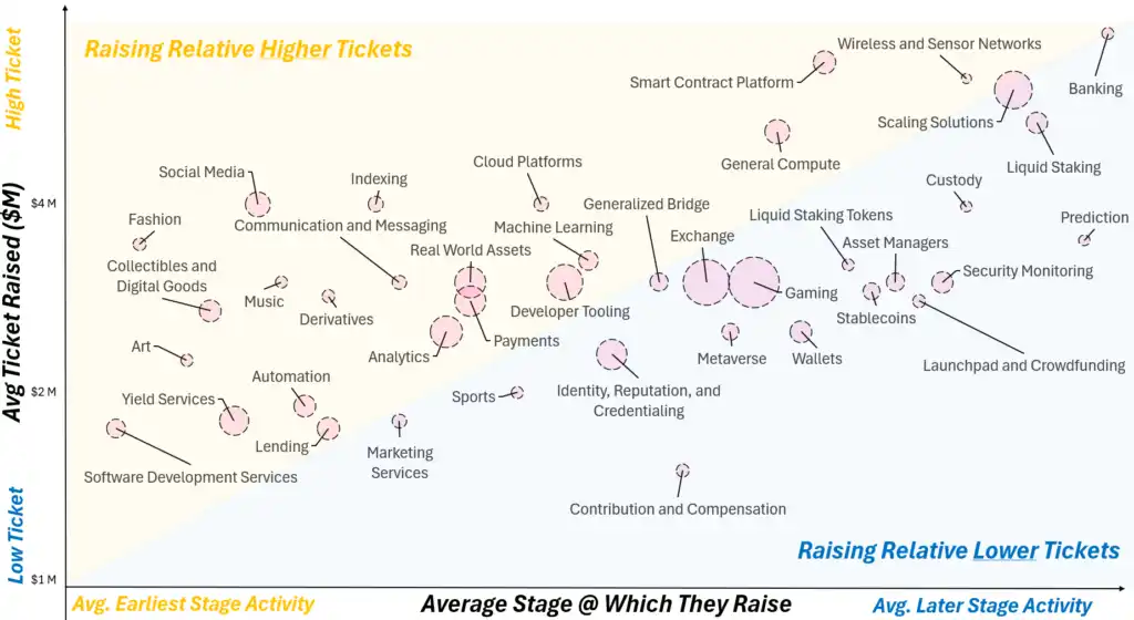 Web3 本身并不是一个行业,而是一种正在改变全行业的技术堆栈。同时 Web3 中没有任何两个赛道是相同的。创始人的背景不同以及项目所提供的区块链解决方案不同。因此,Web3 的各个赛道都对资本有不同的要求。为了让大家更清楚各个赛道对资本的需求,我们将融资规模与各赛道融资阶段相结合,时间区间为 2024 年初至 8 月 11 日,然后得到一个图表:
