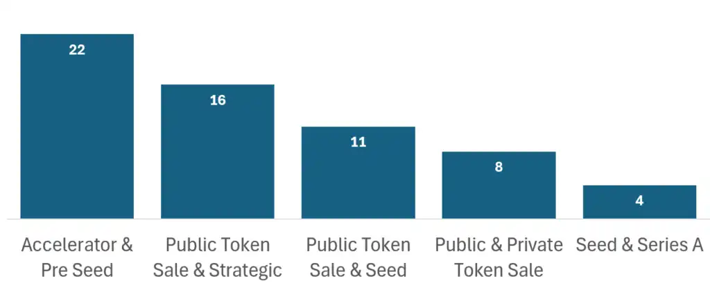 · 种子轮是最活跃的融资阶段,其次是加速器和 Pre-Seed 轮。随着代币上市,Pre-Seed 轮和种子轮之间的差距正在缩小。