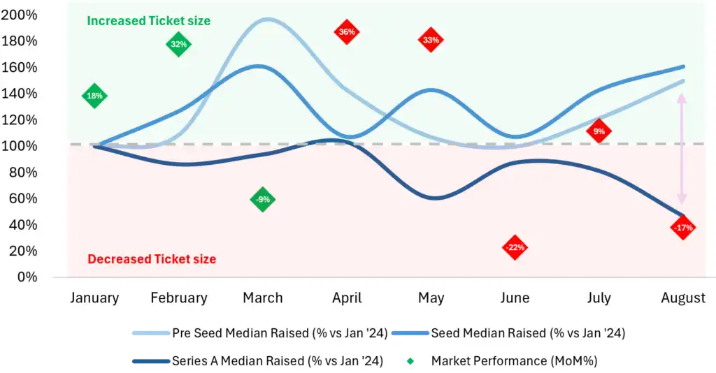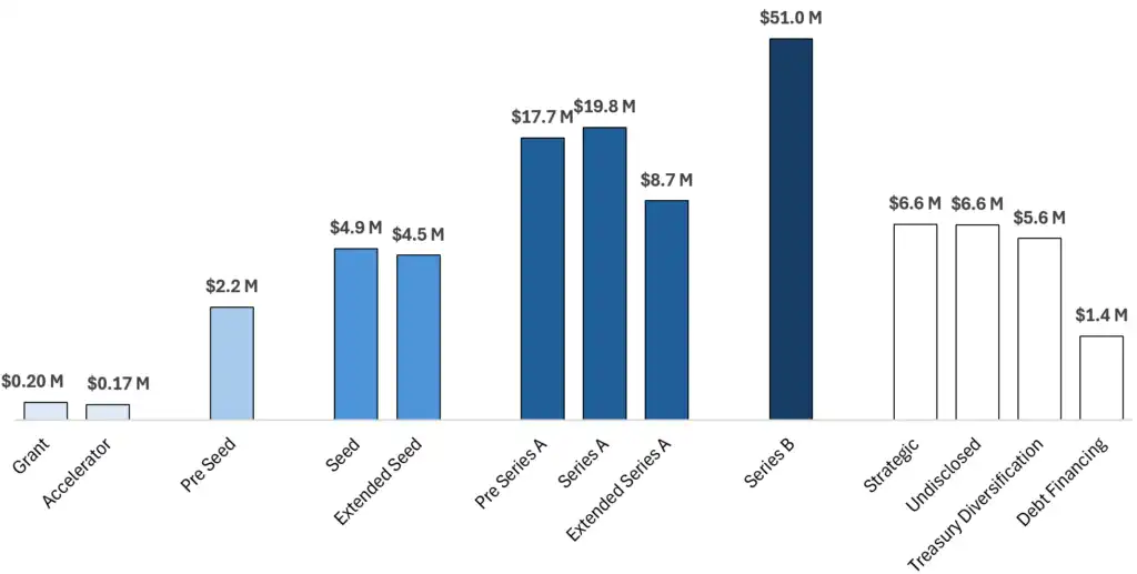 · 2024 年至今,我们统计了各个阶段的平均融资规模:Pre-Seed 轮 220 万美元、种子轮 490 万美元、A 轮 1980 万美元、B 轮 5100 万美元。