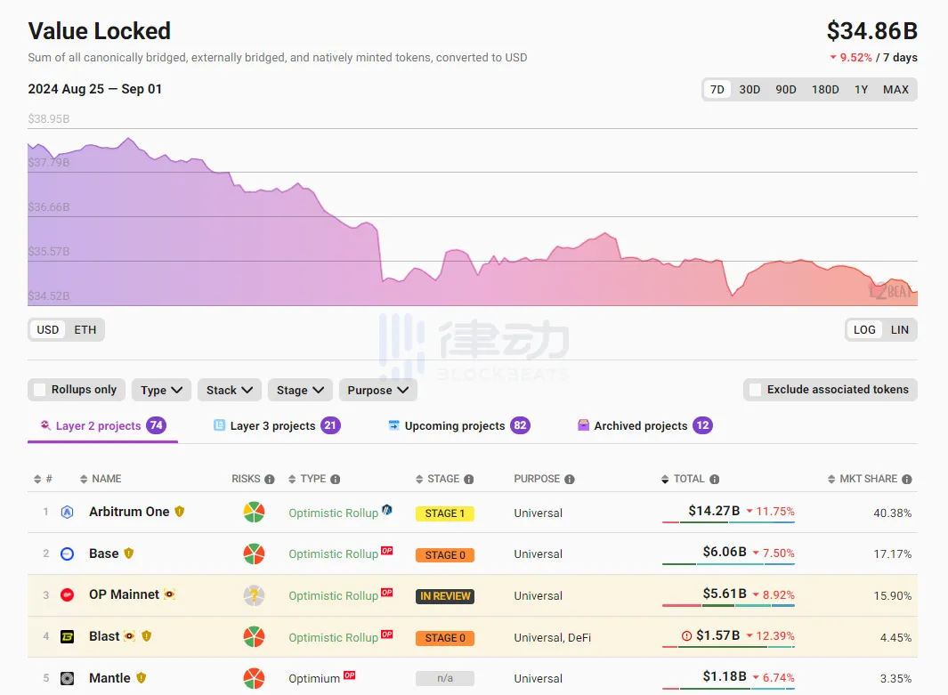 以太坊L2 TVL跌至348.3亿美元,7日跌幅9.52%