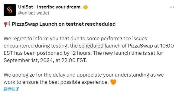 Unisat:PizzaSwap测试网发布时间拟推迟12小时