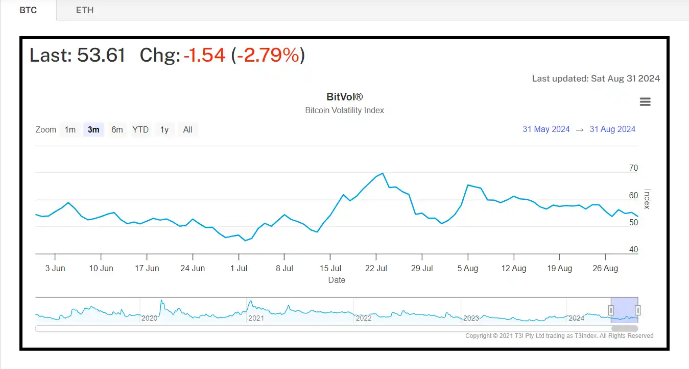 比特币波动指数昨日降至53.61,创7月2日以来新低