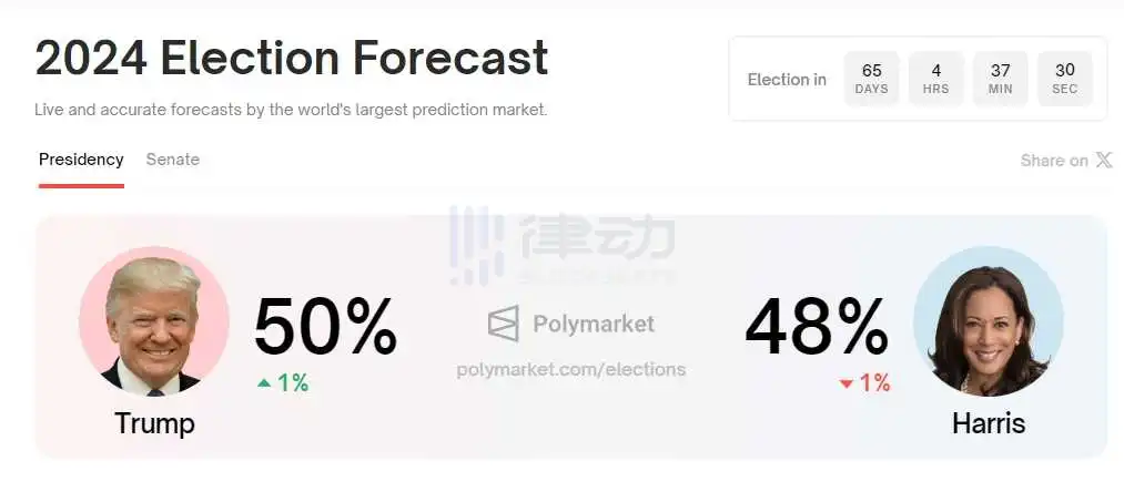 Polymarket上预测特朗普当选概率升至50%,哈里斯胜选概率降至48%