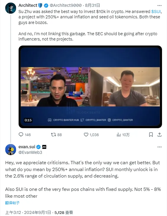 BlockBeats 消息,9 月 1 日,Sui 联合创始人兼 CEO evan.sui 于社交媒体回应有关「SUI 年通胀率超过 250%」的讨论时表示,「我们欢迎批评。这是我们变得更好的唯一途径。SUI 的每月解锁量占流通供应的 2.6% 左右,并且还在减少。