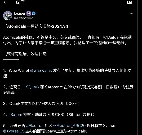 ● @LeaperArc 制作 Atomicals 周汇总。Atom 持有人突破 7000,Quark 中文电报人数突破 4000,Dev 持续建设,多个 KOL,媒体,海外社区多方面宣传,Ordinals World 每日 BTC 生态新闻大爆炸(设有 ARC20 资讯专区)由 Xverse 官方账号同步更新到金色财经和律动。