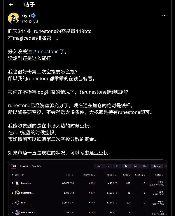 ● 符石 runestone 的日交易量为 4.19 BTC,持续在 @MEonBTC Ordinals 板块排名第一。