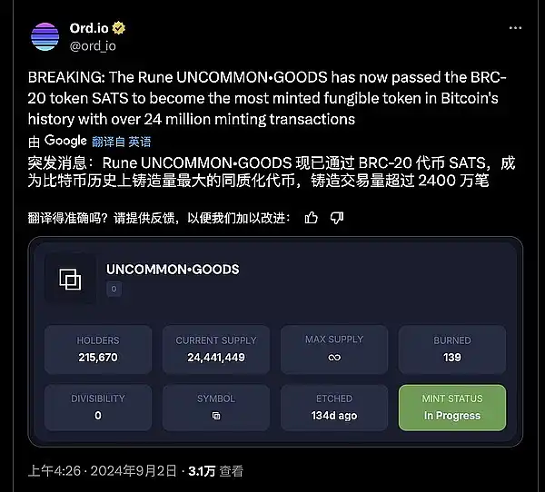● 0 号符文 UNCOMMON•GOODS 现已成为比特币历史上铸造量最大的同质化代币,铸造交易量超过 2400 万笔。