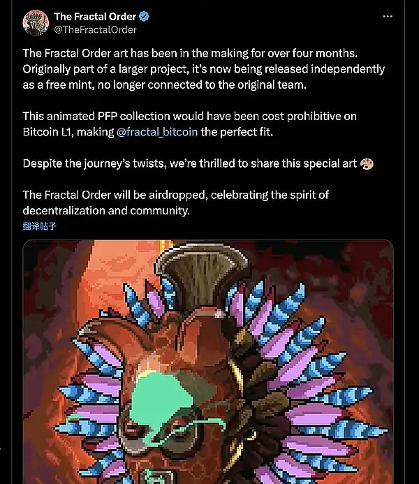 ● 最初 @TheFractalOrder 是一个大型项目的一部分,现在作为免费铸币独立发布,不再与原始团队有联系。因为动画 PFP 系列在比特币 L1 上的成本过高,因此选择 @fractal_bitcoin,会将这些别的艺术品给 Ordinals 社区空投。