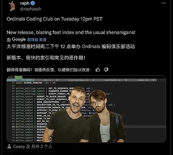 ● Casey @rodarmor & @raphjaph 将于太平洋标准时间周二下午 12 点在 Discors 举办 Ordinals 编码俱乐部活动!新版本、极快的索引、娱乐节目等。
