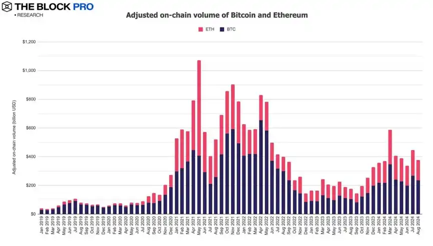 1、八月,比特币和以太坊调整后链上总交易额整体下降了 15.3%,跌至 3770 亿美元,其中比特币调整后链上交易额跌幅达到 12.1%,以太坊跌幅为 20.2%。