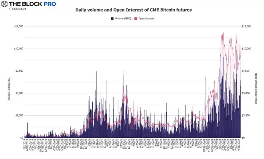 9、八月芝商所比特币期货未平仓量减少 15.3%,降至 90 亿美元,日均成交金额(daily avg volume)下降了 0.2%,减少至约 50.4 亿美元。