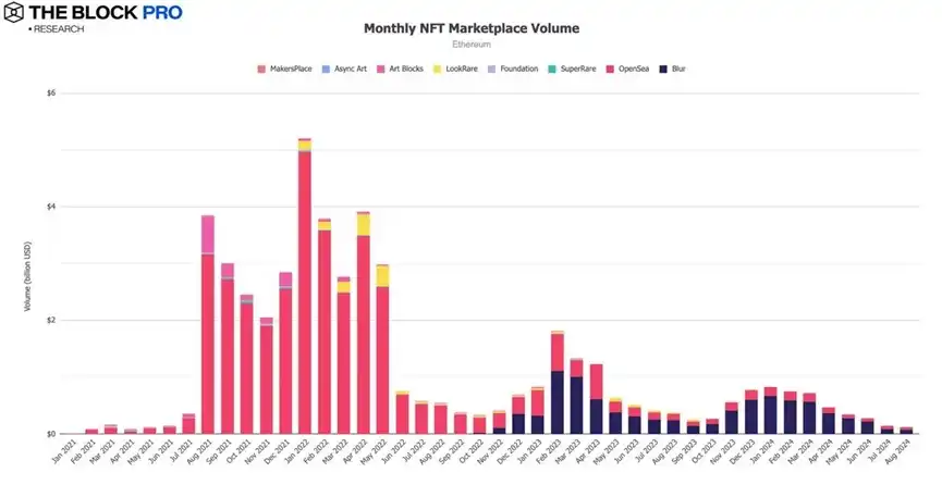 5、八月以太坊链上 NFT 市场交易额再次延续了下降趋势,跌幅 12.8%,进一步降至约 1.232 亿美元。