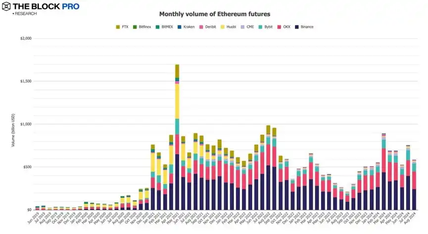 10、八月以太坊期货月均交易额下降 5875 亿美元,跌幅达到 22.2%。
