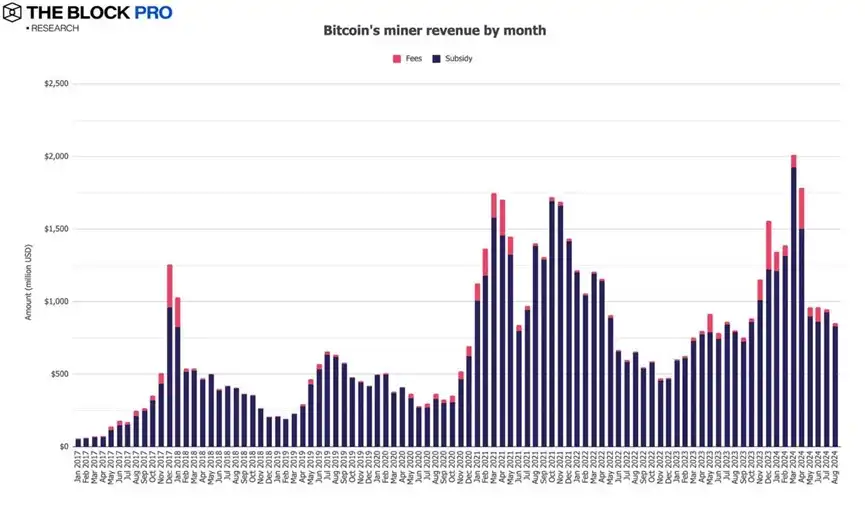 3、比特币矿工收入在八月份达到 8.514 亿美元,下跌幅度为 10.4%。此外,以太坊质押收入也下降了 19.3%,跌到 2.182 亿美元。