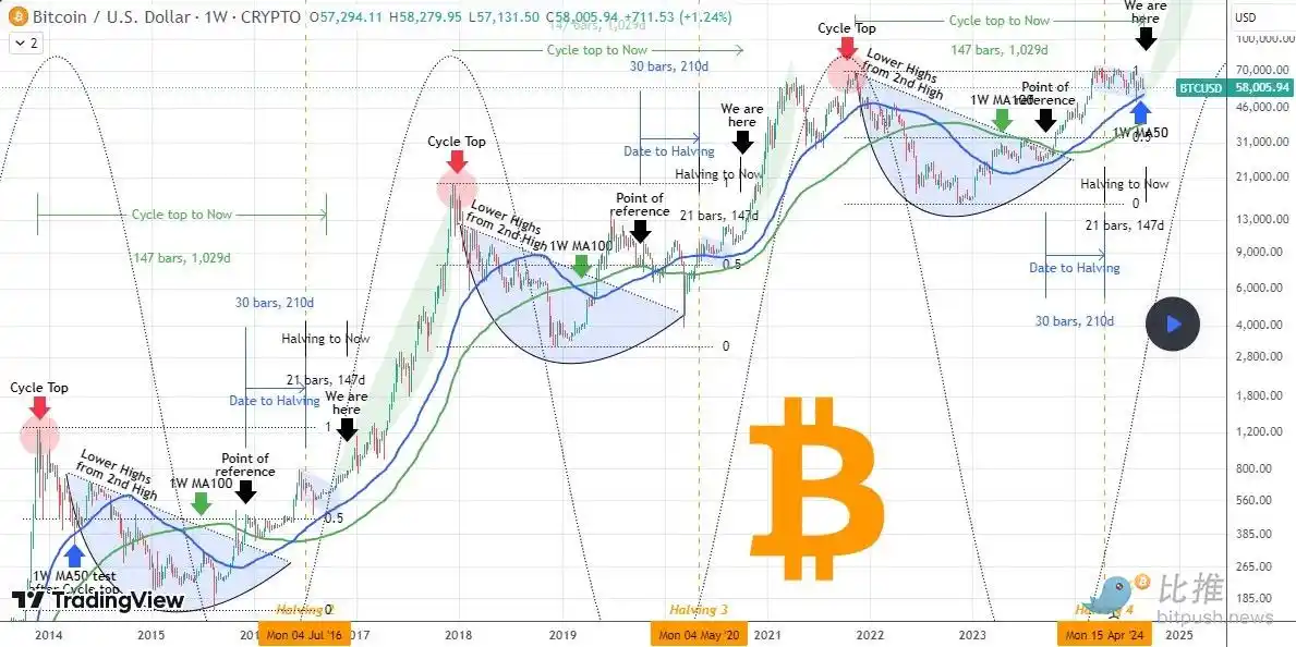 分析师解释称:「经过一些修改,我们可以看到,在 8 月初的测试中成功守住 1W MA50 后,价格应该(相对于过去 2 个周期)开始新的抛物线反弹(上图绿色弧线),我们距离上一个周期顶部有 147 周(1029 天),距离减半有 21 周(147 天)。在过去的周期中,这正是比特币开始大幅上涨的确切时间点(上图『we are here』标记处)。在所有情况下,1W MA50 都守住了,所以现在市场的目标是保持其不变,这样买家就不会失去心理支撑位,如果守住该水平,突破 10 万应该是最低预期,尤其是在本月开始降息周期和 11 月美国大选(传统上市场在大选后看涨)之前。」