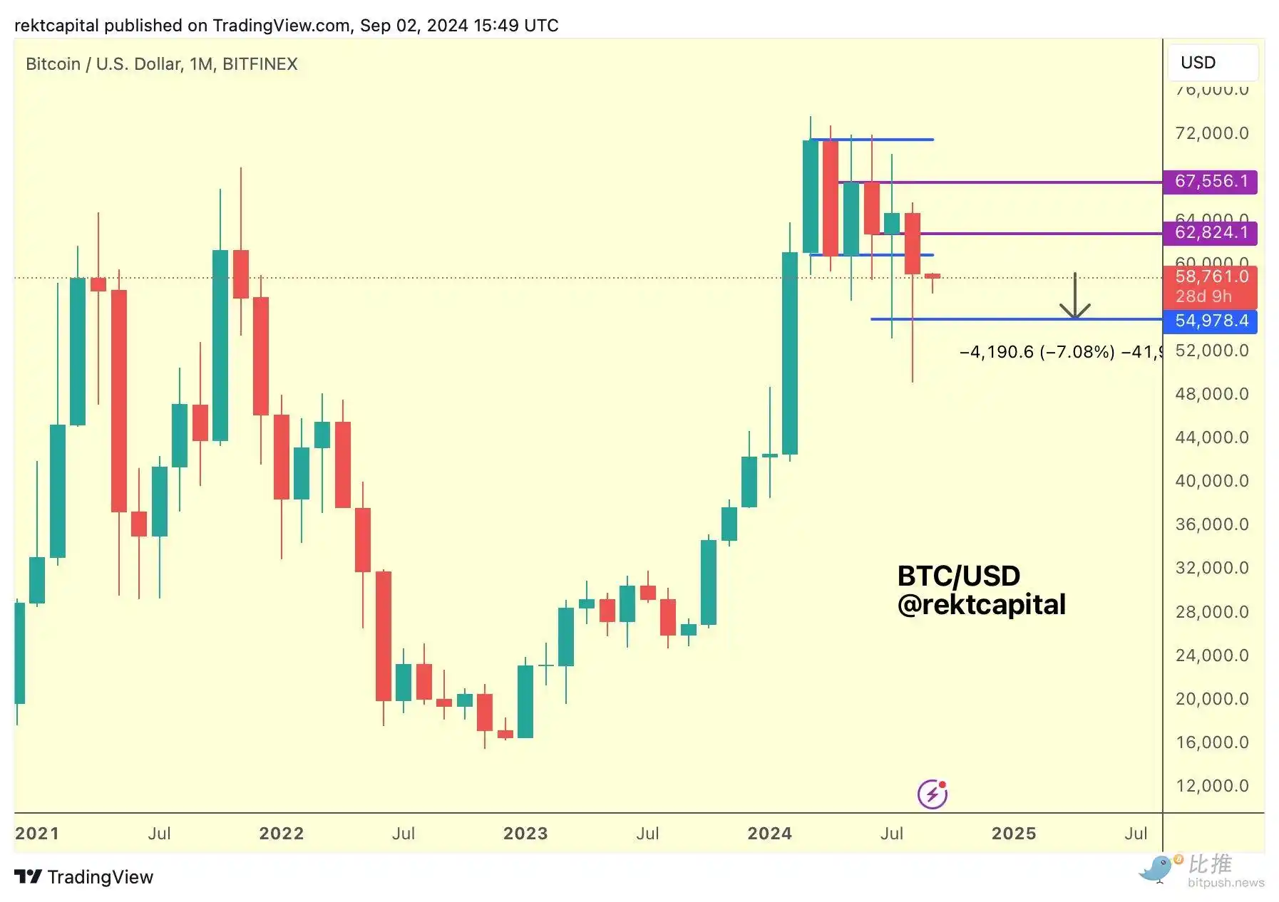 Rekt Capital 警告称:「如果比特币在今年 9 月份也出现历史上常见的 7% 的下跌……那就意味着比特币将再次跌至 55,000 美元左右。」