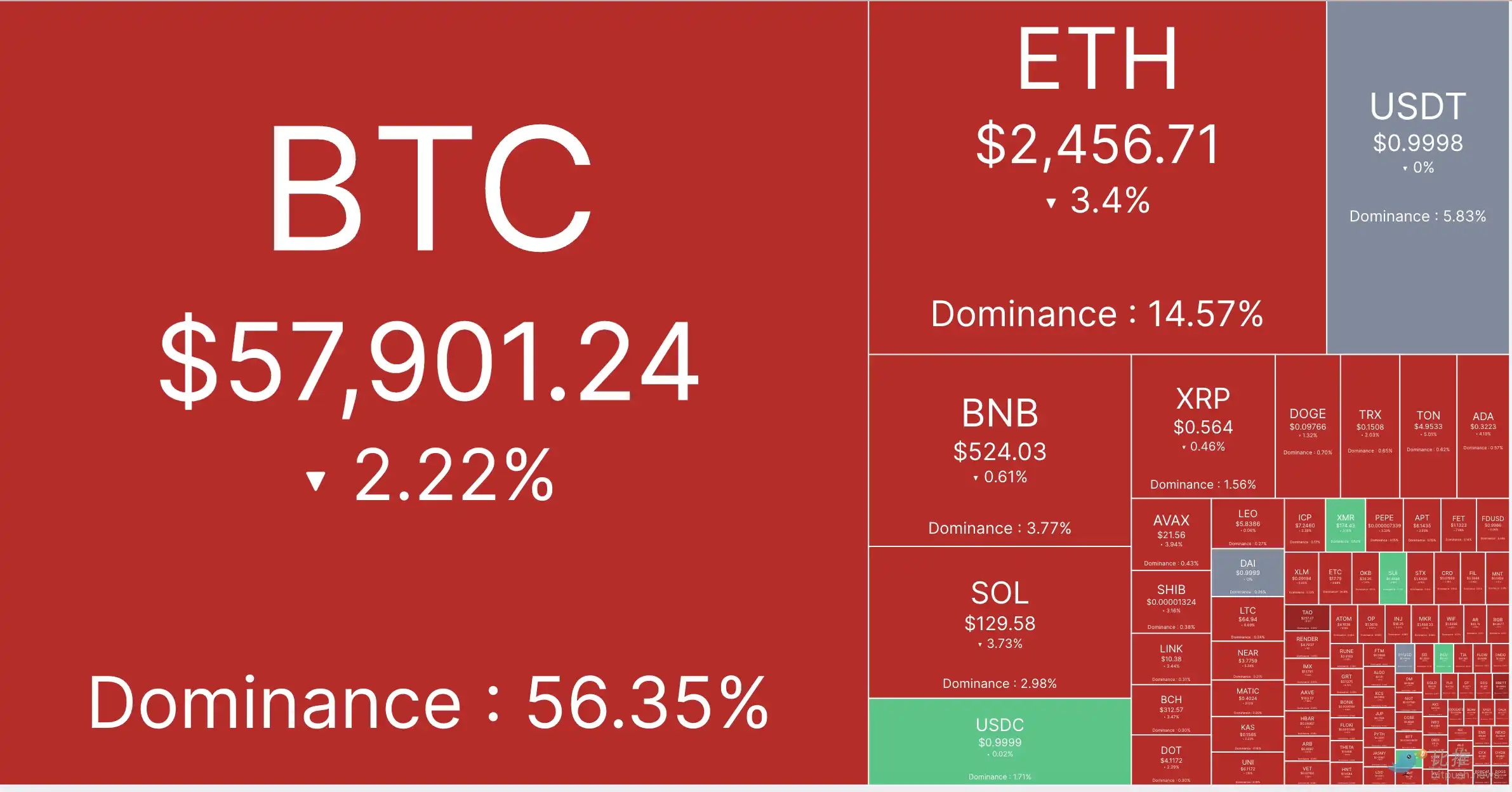 比推数据显示,比特币在周二凌晨触及 59,840 美元的日内高位,但在午盘后回落至 57,500 美元支撑位,随后有所反弹,截至发稿时,BTC 交易价格为 57,901 美元,24 小时跌幅 2%。