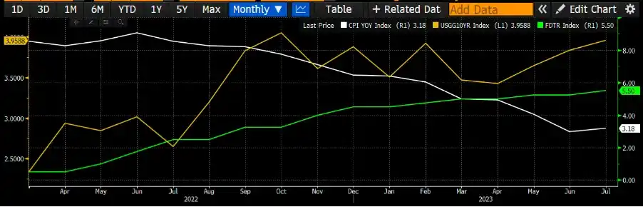 然而,这一切在 2023 年 8 月的杰克逊霍尔会议上发生了变化。鲍威尔暗示,美联储可能在 9 月会议上暂停加息。然而,通胀的阴影仍然笼罩市场,主要因为政府支出的增加是推动通胀的主要因素,而这种趋势没有减弱的迹象。