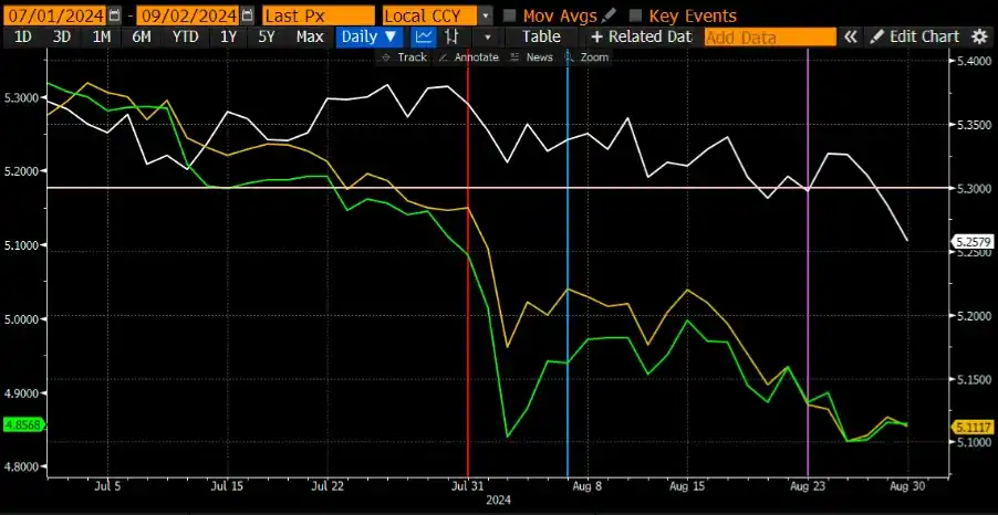 接着,我考虑到货币市场基金(MMF)是否因为国库券收益率下降,而选择卖出国库券并将现金存入 RRP,以追求更高的短期美元收益。我绘制了一张图表,展示了 1 个月(白色)、3 个月(黄色)和 6 个月(绿色)国库券的收益率。图中的垂直线标记了几个关键日期:红线代表日本央行加息的日子,蓝线代表日本央行在市场反应不佳时宣布不会考虑未来加息的日子,紫线则是杰克逊霍尔会议演讲的日子。