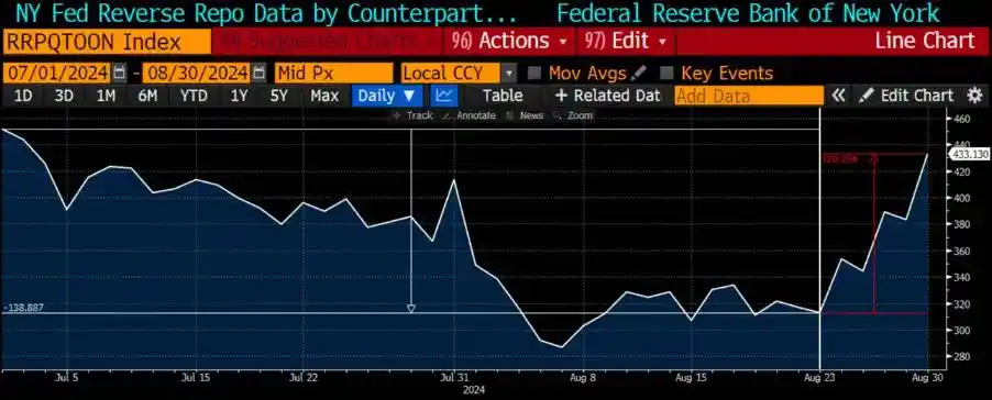 历史不会简单重复,但总是有相似之处。在我之前的文章 Sugar High 中,我未能充分认识到这一点,当时我讨论了鲍威尔工资政策转变的影响。对于即将到来的降息对风险市场的正面影响,我与大多数人持有相同的看法,这让我有些不安。在去首尔的路上,我偶然查看了我的彭博观察名单,上面记录着 RRP 的每日变化。我注意到 RRP 上升了,这让我感到困惑,因为我本以为由于美国财政部的净国库券发行,它会继续下降。我深入研究后发现,这一上升始于 8 月 23 日,也就是鲍威尔政策转变的那一天。我还考虑到 RRP 的激增是否可能由于季度末的粉饰账面造成。金融机构通常在季度末会将资金存入 RRP,并在下周撤出。但第三季度要到 9 月 30 日才结束,因此粉饰账面无法解释这一现象。