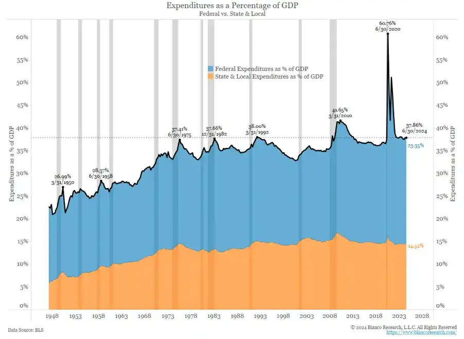在和平时期,总体政府支出达到了历史最高水平。当然,这里的「和平」是相对的,仅指帝国公民的感受;对于那些因美国武器而丧命的人来说,近几年几乎称不上和平。