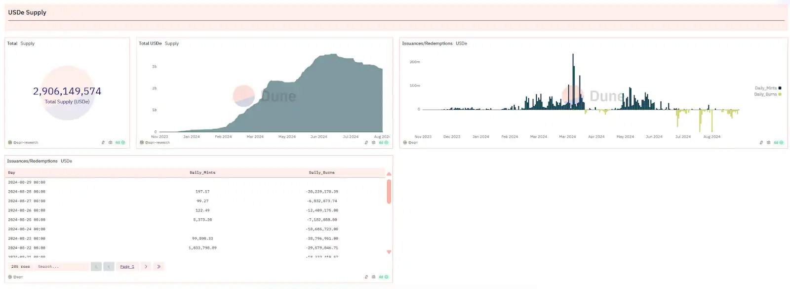 根据 Dune Analytics 的数据,USDe 在最近一个月中经历了多次价值千万美元的销毁事件,这通常表明有大量抵押品被赎回。此外,从 sUSDe(USDe 质押凭证代币)的供应情况也可以看出,过去一周内有超过 1 亿美元的 sUSDe 完成了质押解除。