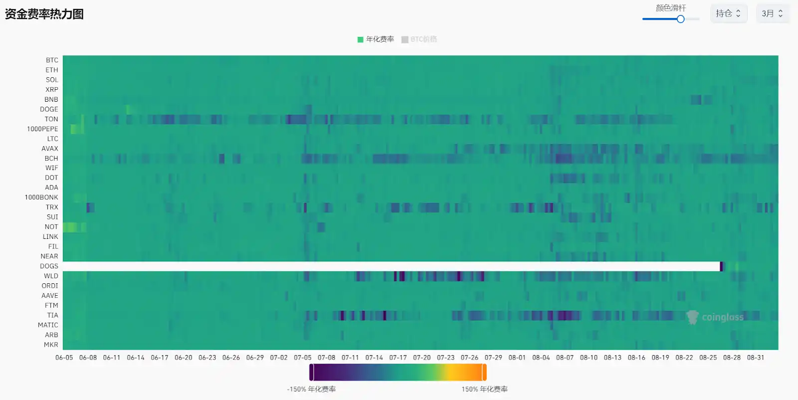 根据 Coinglass 数据,市场自从 5 月份进入震荡期以来,资金费率便逐步降低,在很多时候甚至转为负值,这意味着 Ethena 的保证金(抵押物)将开始被蚕食甚至被清算,到时候就只会剩下一个没有任何支撑的资产。