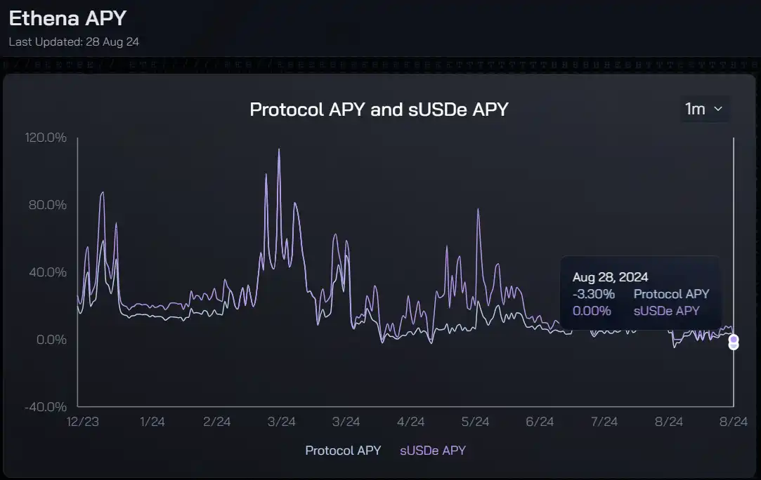 根据 Ethena Dashboard 数据显示,其协议收益率和 sUSDe 收益率在三月初达到最高点 113.34%,截止至 08.28 协议收益率已为负值 -3.3%,sUSDe 收益率已变动为 0。