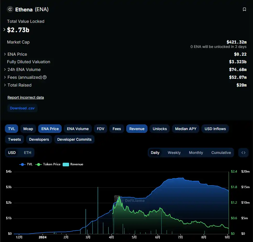 根据 DeFiLama 的数据,Ethena TVL 目前为 27.3 亿美元,已跌破 30 亿美元大关,相较于七月初的峰值 36.12 亿美元,减少了近 9 亿美元。自 3 月以来,Ethena Labs 的收入显著下降。8 月份的收入仅为 103 万美元,与巅峰时期的 2626 万美元相比,下降了约 96%。按照最近 30 天的收入计算,Ethena Labs 的年收入预计仅为 1255 万美元。