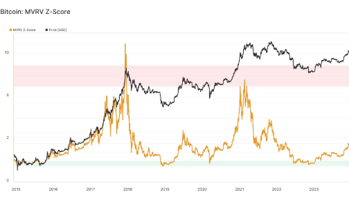 截至目前,Z分数为1.6,表明加密货币离被高估还有一定距离,可能会在明年继续上涨,正如一些分析师所预期的那样。从历史数据来看,Z分数超过八表明被高估并标志着牛市顶部,而负值表明打折价格并标志着熊市底部。