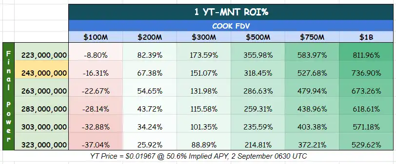 根据 Pendle 公布的数据,在隐含 APY 为 10% 时买入 Mantle YT-MNT 的持有者,目前可以获得 5 倍的收益。以下是各种条件下 YT- MNT 的投资回报变化。当 Mantle 积分为 243,000,000 时,若 Cook FDV 达到 3 亿美元,YT- MNT 回报率为 151.07%,如果 FDV 达到 10 亿美元,用户的回报率能达到 736.90%。