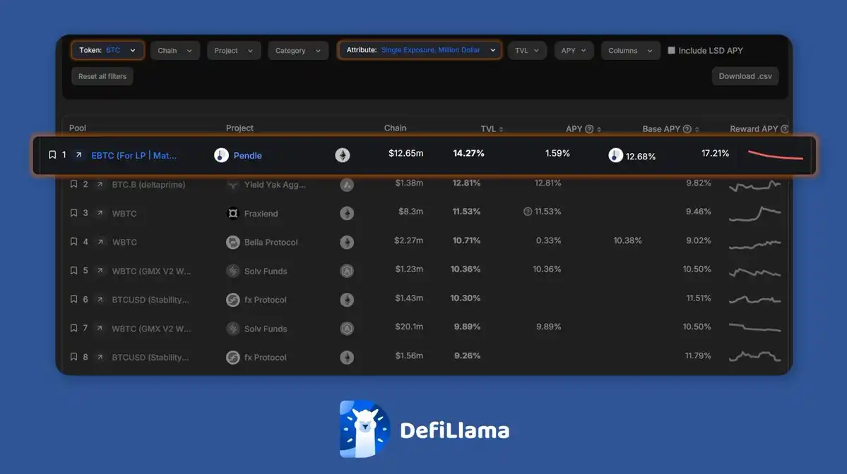 根据 Defillama 的数据,Pendle 为 Etherfi eBTC 持有者提供32.8% 的 APY,这一产品特点包括单一敞口且无无常损失(IL)风险,用户可随时提取所持资产,享受极高的灵活性。