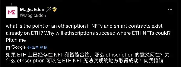 ● Magic Eden @MagicEden 对以太坊铭文社区提问 @dumbnamenumbers @ethscriptions 如果 ETH 上已经存在 NFT 和智能合约,那么 ethscription 的意义何在?为什么 ethscription 可以在 ETH NFT 无法实现的地方取得成功?包括 okx 的 eths 介绍视频,社区回复大量 eths 优势陈述,不仅仅限于 NFT,还有 ETH 主网扩容方案等。