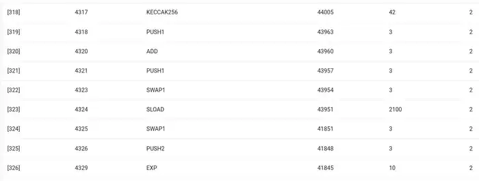 ENS 哈希更新的 EVM 跟踪。倒数第二列是 gas 消耗。