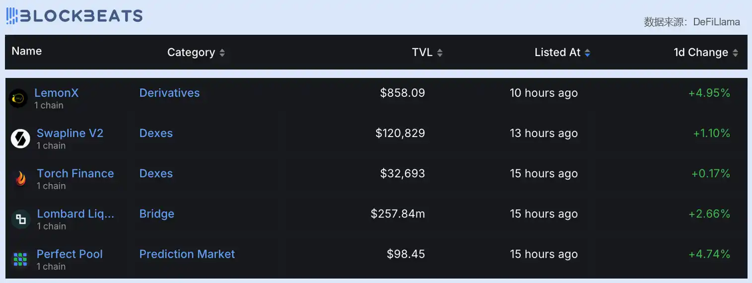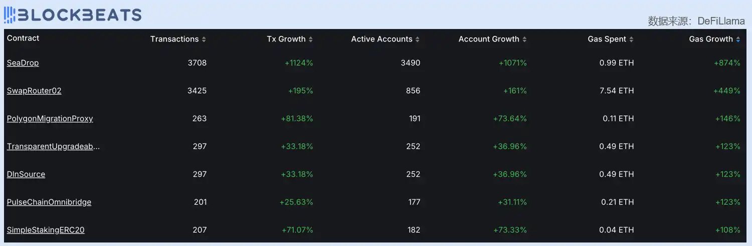 以太坊生态每日合约动态观察,按 Gas 消耗增速及部署时间筛选并排列,数据来源:DeFiLlama