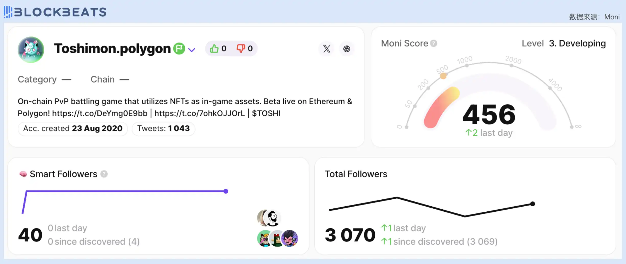 Toshimon 是一款链上 PvP 战斗游戏,利用 NFT 作为游戏内资产,已在以太坊和 Polygon 上线了 Beta 测试版。