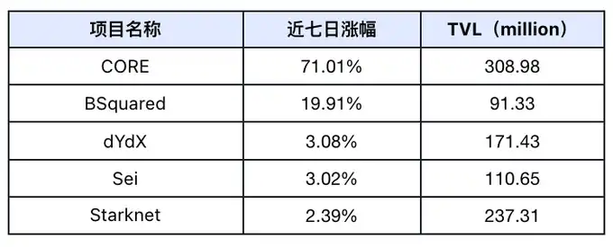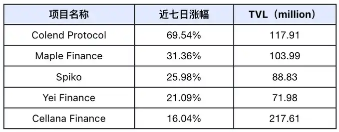 过去一周市场项目 TVL 涨幅前 5 名(未计入 TVL 较小的公项目,标准为 3000 万美元以上),数据来源:Defilama