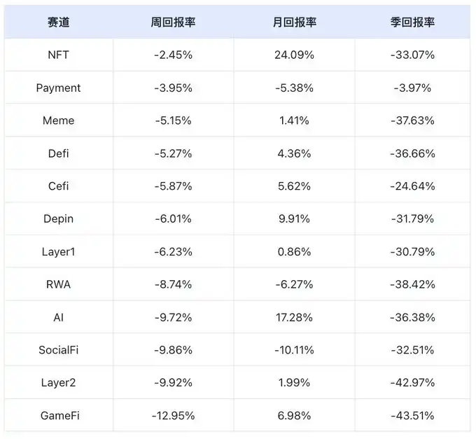 按周回报率统计,NFT 赛道表现最佳,而 GameFi 赛道表现最差。