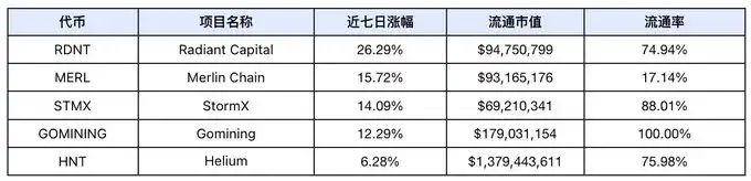 过去一周市场代币涨幅前 5 名(未计入交易量过小的代币和 meme 币),数据来源:Coinmarketcap