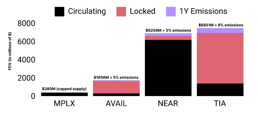 与其他项目相比,MPLX 代币总量 3.8 亿枚,有限供应且全部处于流通中,AVAIL 存在较大额度的未解锁代币,且有 5% 的排放,NEAR 总量过多且也有 5% 的排放,而 TIA 目前处于高 FDV 高未解锁占比的情况,且有着最高的 8% 排放。