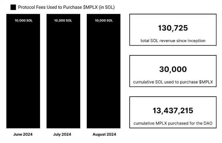 Metaplex 自创立以来共收入 13.07 万枚 SOL,2024 年 6、7、8 三个月,每月都有 1 万枚 SOL 用于回购 MPLX,累计已斥资 3 万枚 SOL 用于回购 MPLX,为 DAO 累计购买的 MPLX 数量达到 13,437,215 枚。